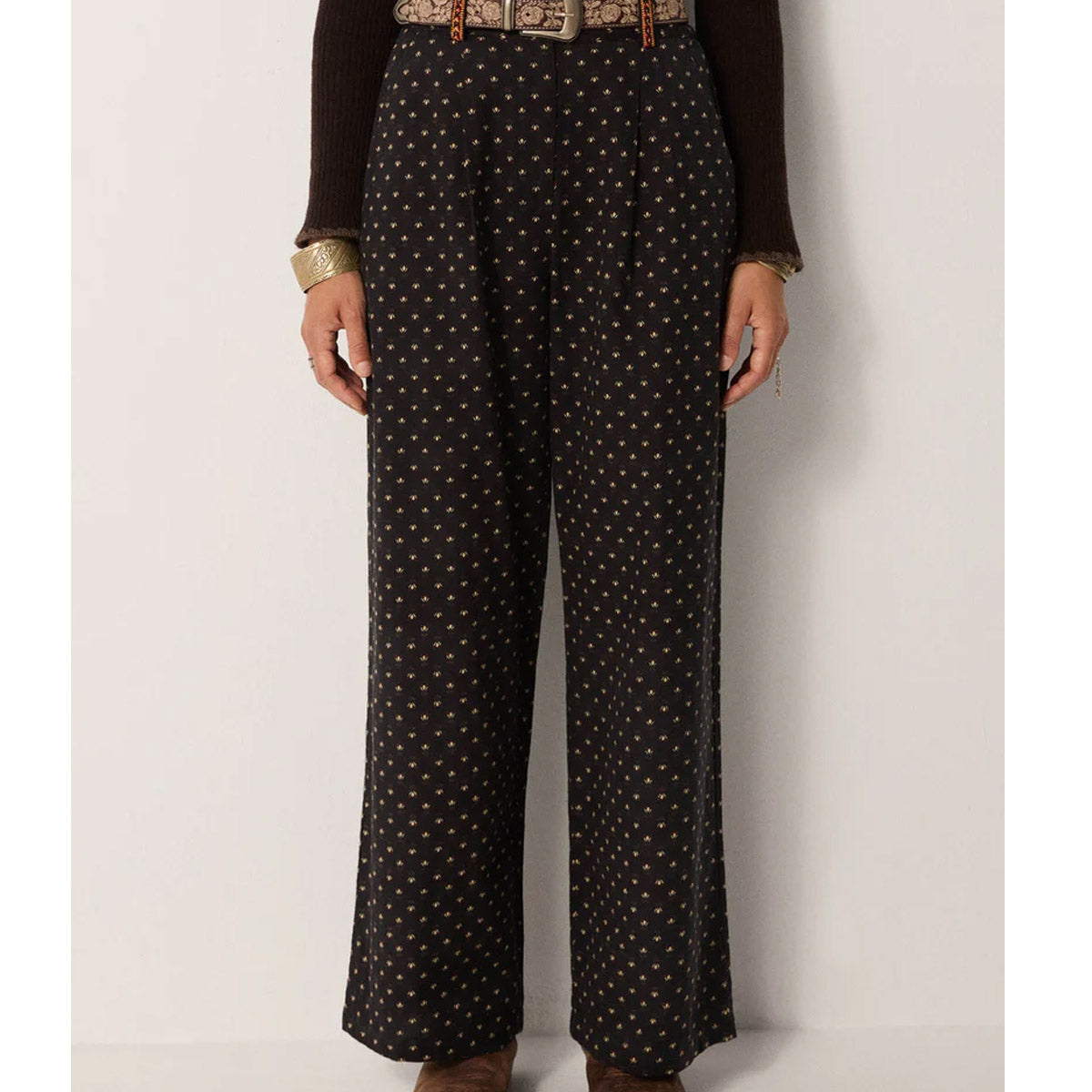 Crafted from a cotton-linen blend, the Diego Black Coffee Pant delivers effortless sophistication with a wide-leg silhouette that moves beautifully. The deep black fabric features delicate golden block-print detailing, adding artisanal character without overwhelming the design. A relaxed high rise and pleated front create a refined, comfortable fit that works across seasons and occasions.
